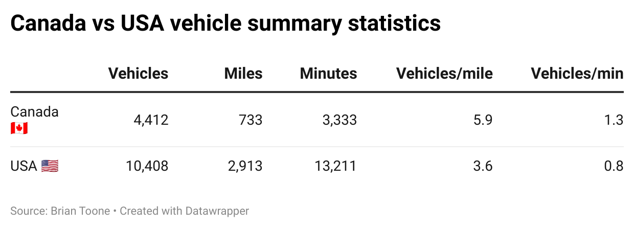That’s about how many vehicles passed me on this adventure while I had my radar enabled. This equates to just over 4 vehicles passing me every mile or 1 vehicle every minute. (4.06 vehicles/mi and 0.95 vehicles/min). But the overall average doesn’t reflect the significant difference between Canada and the USA. Here’s a breakdown: