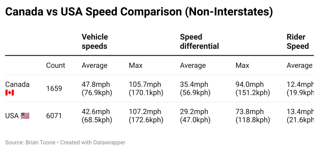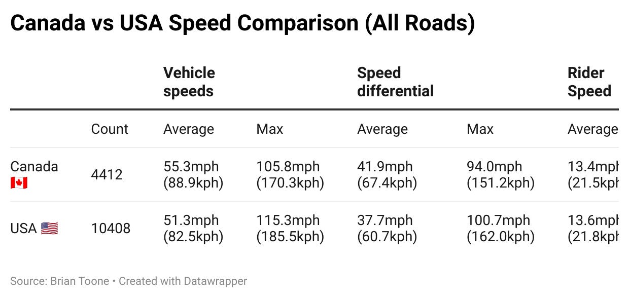 Table 4 below shows the standard deviations for all three values (absolute speed, relative speed (i.e., speed differential), and rider speed) for overall and the various road types. I am wondering if there is something interesting there. The deviation in my own “rider speed” is significantly higher in Canada, but the standard deviations between absolute passing speeds and relative passing speeds are identical! Contrast this with the USA standard deviations, where my rider speed standard deviation is lower and the standard deviation difference between absolute and relative speeds is higher!