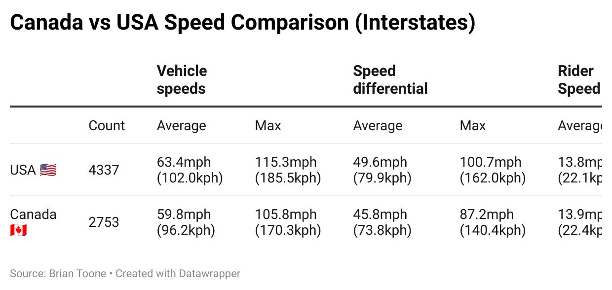 Looking at Interstates only (Table 2), Americans are back in the fast lane. Speed limits could factor into this. The only Interstates I ended up on were I-90 and I-25, both with speed limits of 80mph for most of the sections I was on. Some of the more mountainous sections had 70mph or even 65mph, but those sections were short. In Canada, most of the Trans Canada highway sections I rode, had speed limit of 110kph, which I believe equates to just under 70mph.