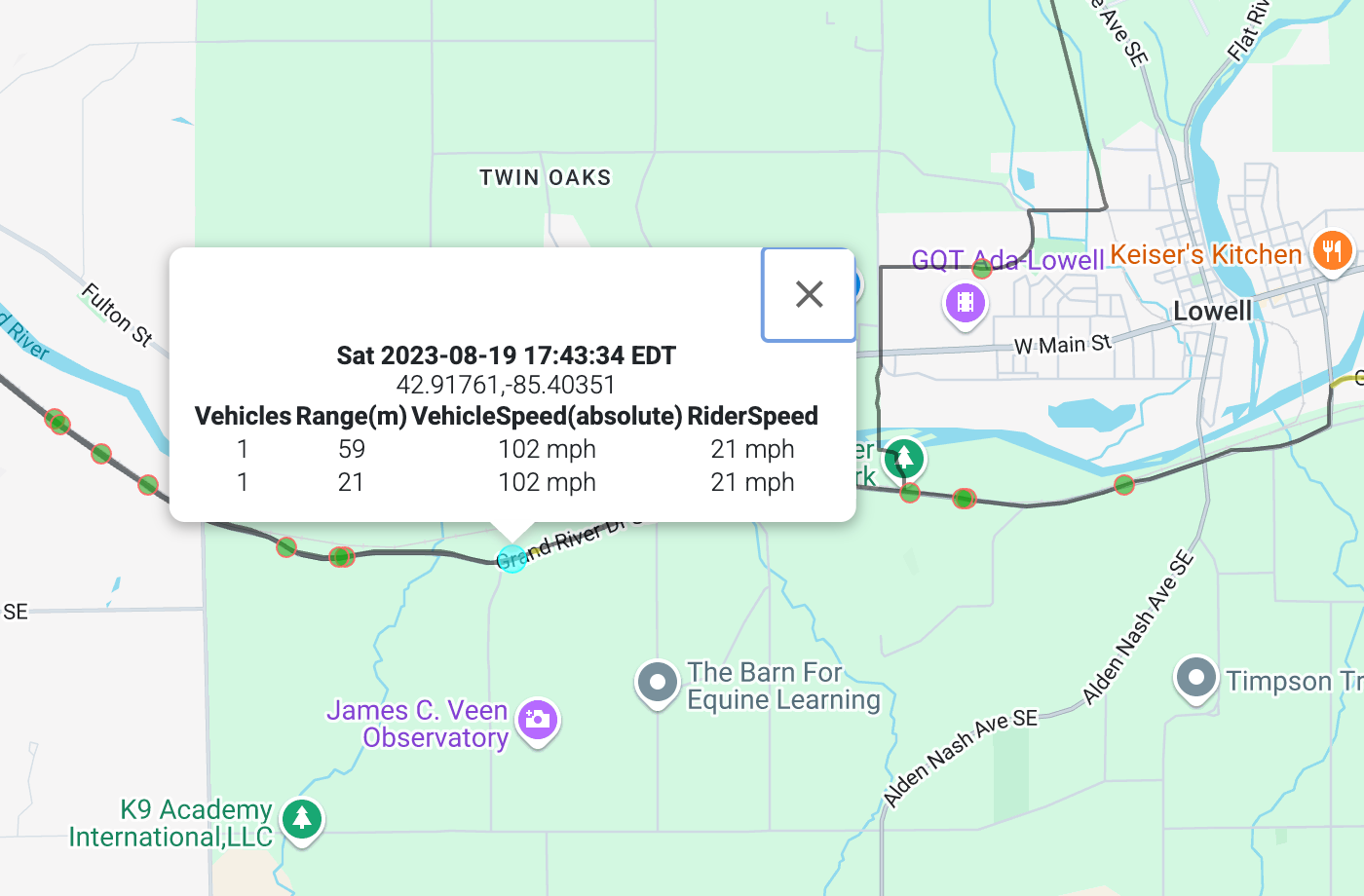 But prior to working on that update, I have already updated the backend on mybiketraffic.com to allow the user to set their own threshold of which cars to count. Since the threshold now depends on both distance and speed, the configurable unit is now time. A mybiketraffic user will soon be able to specify the distance threshold as the number of seconds it would take the car to pass if they continued at their current speed. The default (and lowest value) is 1 second. Even at this lowest value, the Ferrari would not have been missed. The closest reading was 21m, but the car was traveling 36 m/s faster than the cyclist, 36 m/s * 1 second = 36 meters for the threshold. 21m is well within 36m, and thus, this car would have been counted.