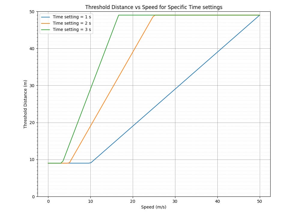 The threshold values are still distance, but configurable via time per the chart below showing three different time settings (1s, 2s, and 3s). Here is the official threshold calculation formula based on the speed of the car and the user time setting: